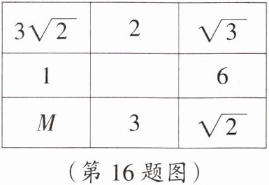 16. 在如图所示的方格中,若要使横、竖、斜对角的 3 个实数相乘都得到同样的结果,则空格中$M$代表的实数为 (