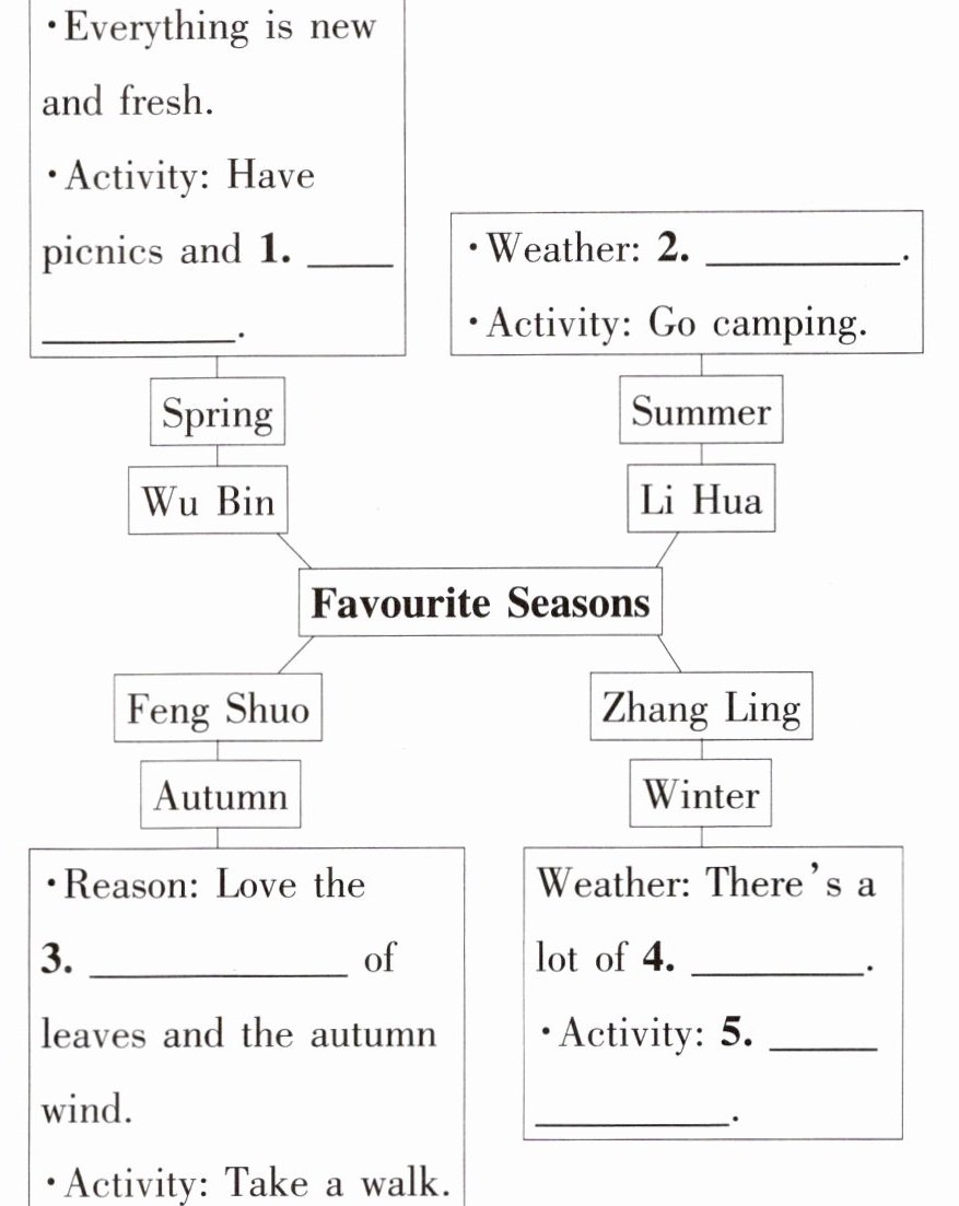 Li Hua: I like summer best. It's very cool in my hometown, and it's nice to have a long and sunny summer. There are a lot of outdoor activities you can take part in, such as going camping. My least favourite is winter, because it's pretty cold, and you don't want to go outside.