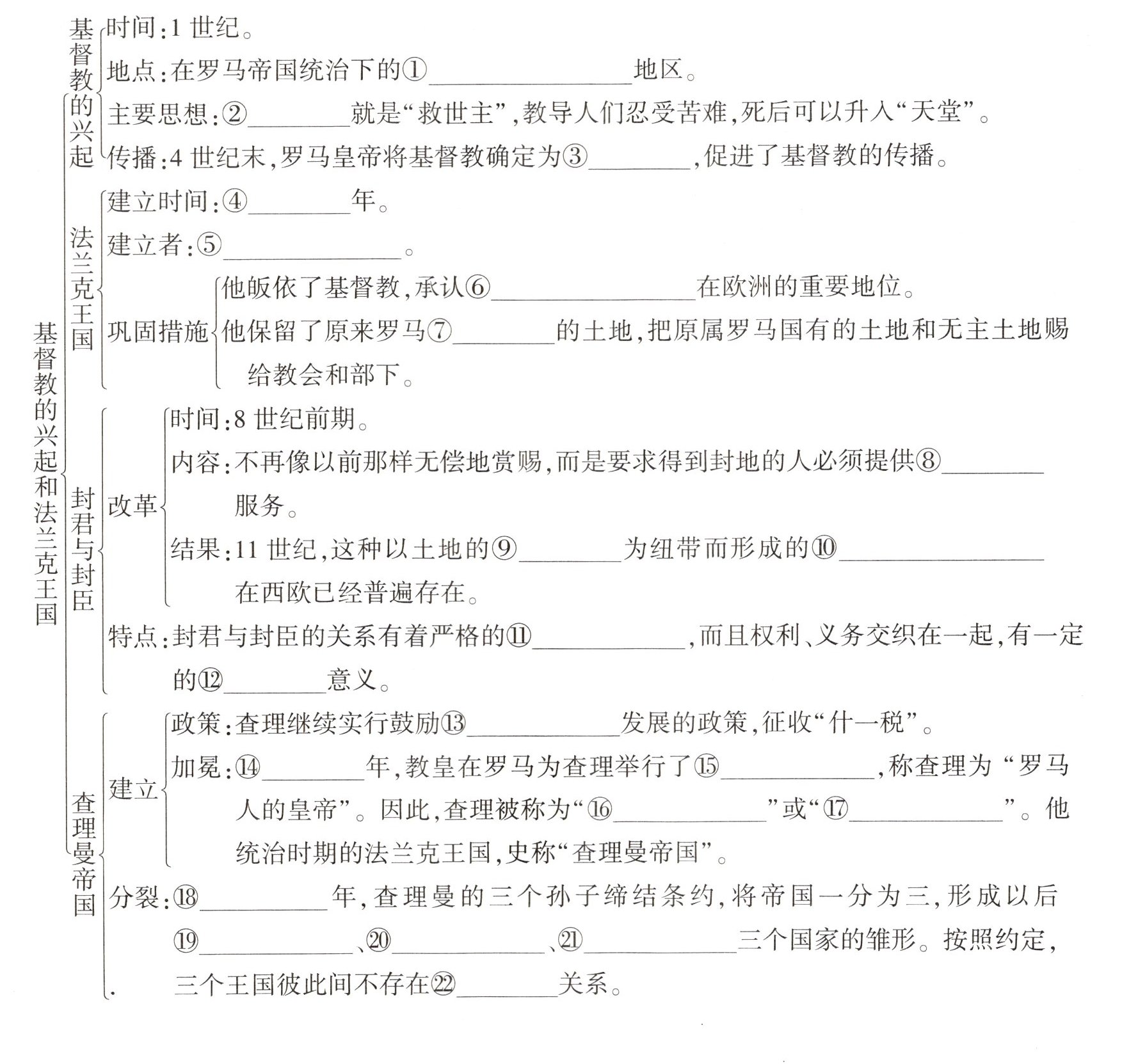 ①巴勒斯坦 ②耶稣 ③国教 ④481 ⑤克洛维 ⑥罗马教会 ⑦大地主 ⑧兵役 ⑨封赐 ⑩封建制度 ⑪等级性 ⑫契约 ⑬基督教 ⑭800 ⑮加冕礼 ⑯查理大帝 ⑰查理曼 ⑱843 ⑲德意志 ⑳法兰西 ㉑意大利 ㉒隶属