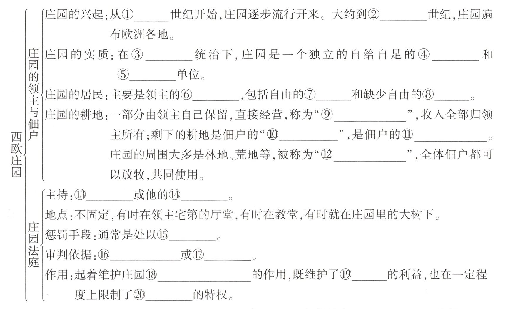 ①9 ②11 ③领主 ④经济 ⑤政治 ⑥佃户 ⑦农民 ⑧农奴 ⑨自营地 ⑩份地 ⑪生活来源 ⑫共用地 ⑬领主 ⑭管家 ⑮罚金 ⑯习惯法 ⑰村法 ⑱公共秩序 ⑲领主 ⑳领主