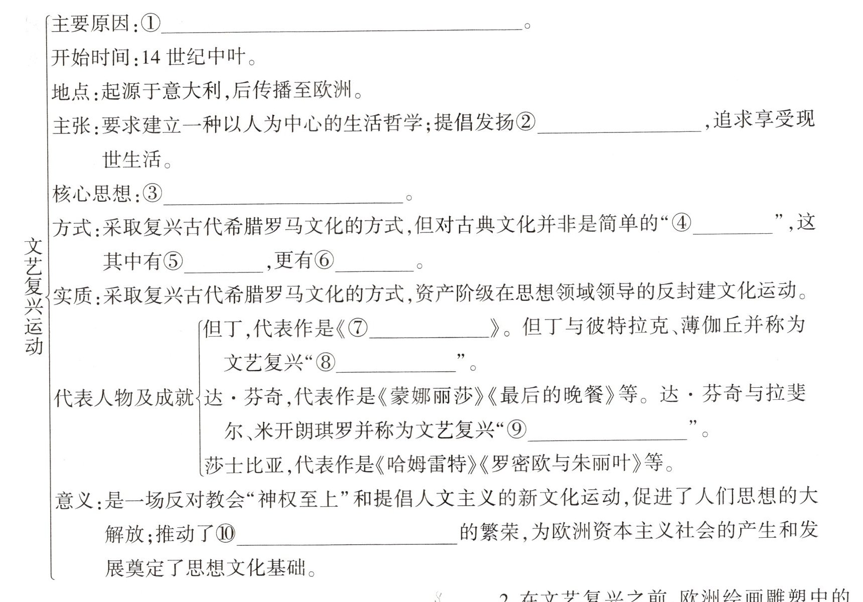 ①资本主义萌芽 ②人的个性 ③人文主义思潮 ④复兴 ⑤继承 ⑥创新 ⑦神曲 ⑧文学三杰 ⑨美术三杰 ⑩欧洲文化思想领域