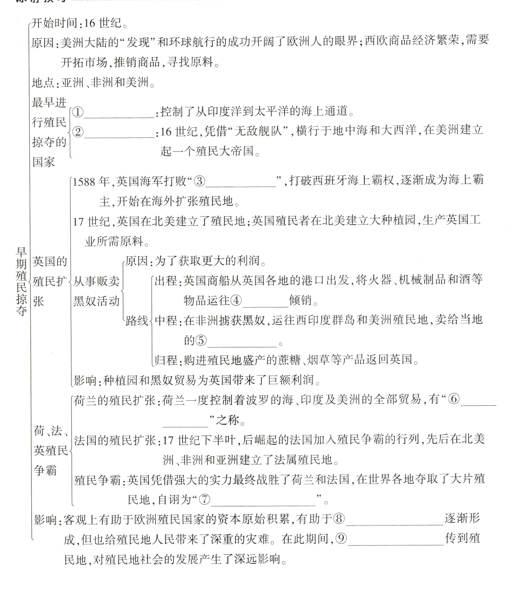影响:客观上有助于欧洲殖民国家的资本原始积累,有助于⑧逐渐形成,但也给殖民地人民带来了深重的灾难。在此期间,⑨传到殖民地,对殖民地社会的发展产生了深远影响。