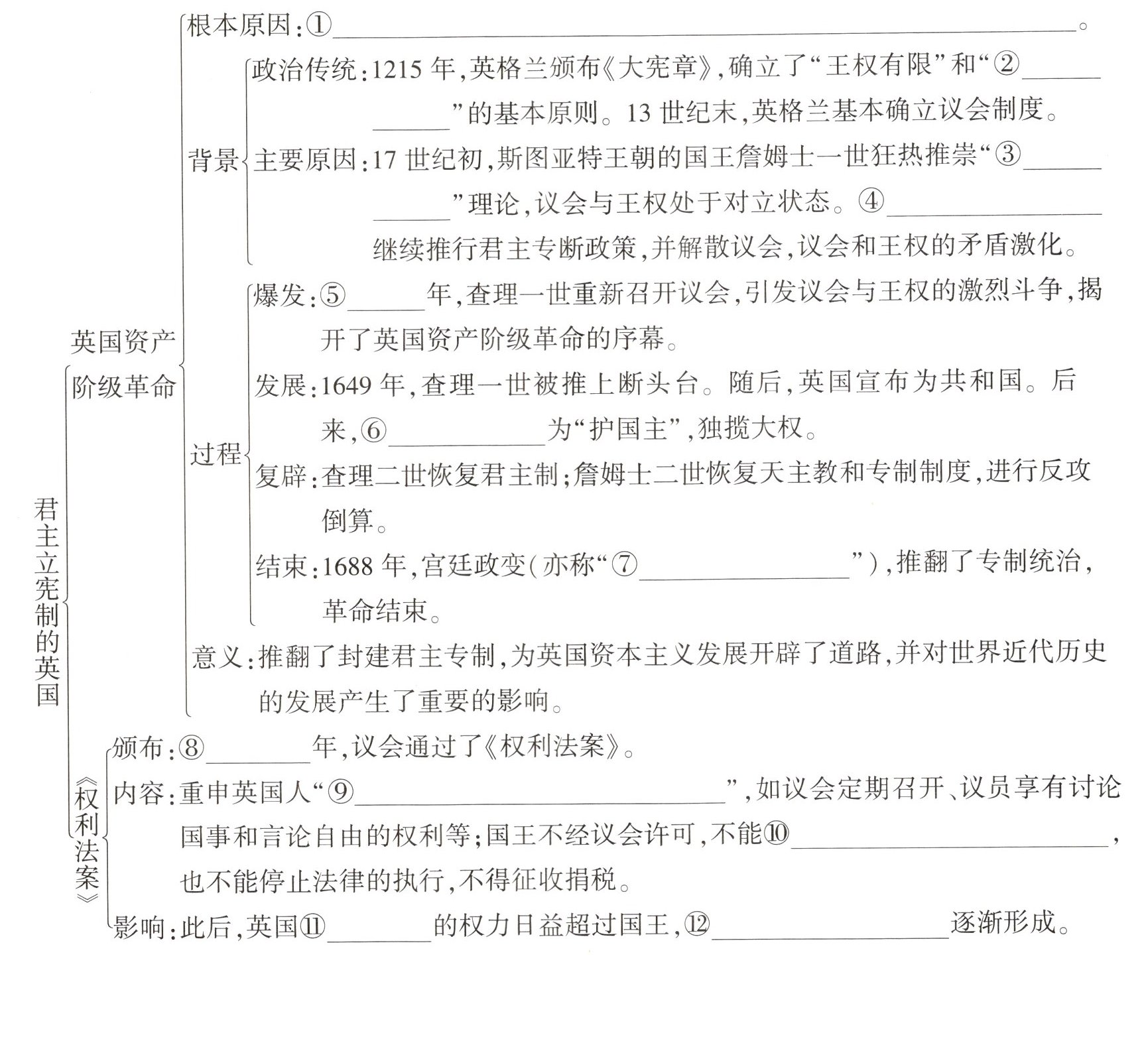 **内容**:重申英国人“⑨”,如议会定期召开、议员享有讨论国事和言论自由的权利等;国王不经议会许可,不能⑩,也不能停止法律的执行,不得征收捐税。- **影响**:此后,英国⑪的权力日益超过国王,⑫逐渐形成。