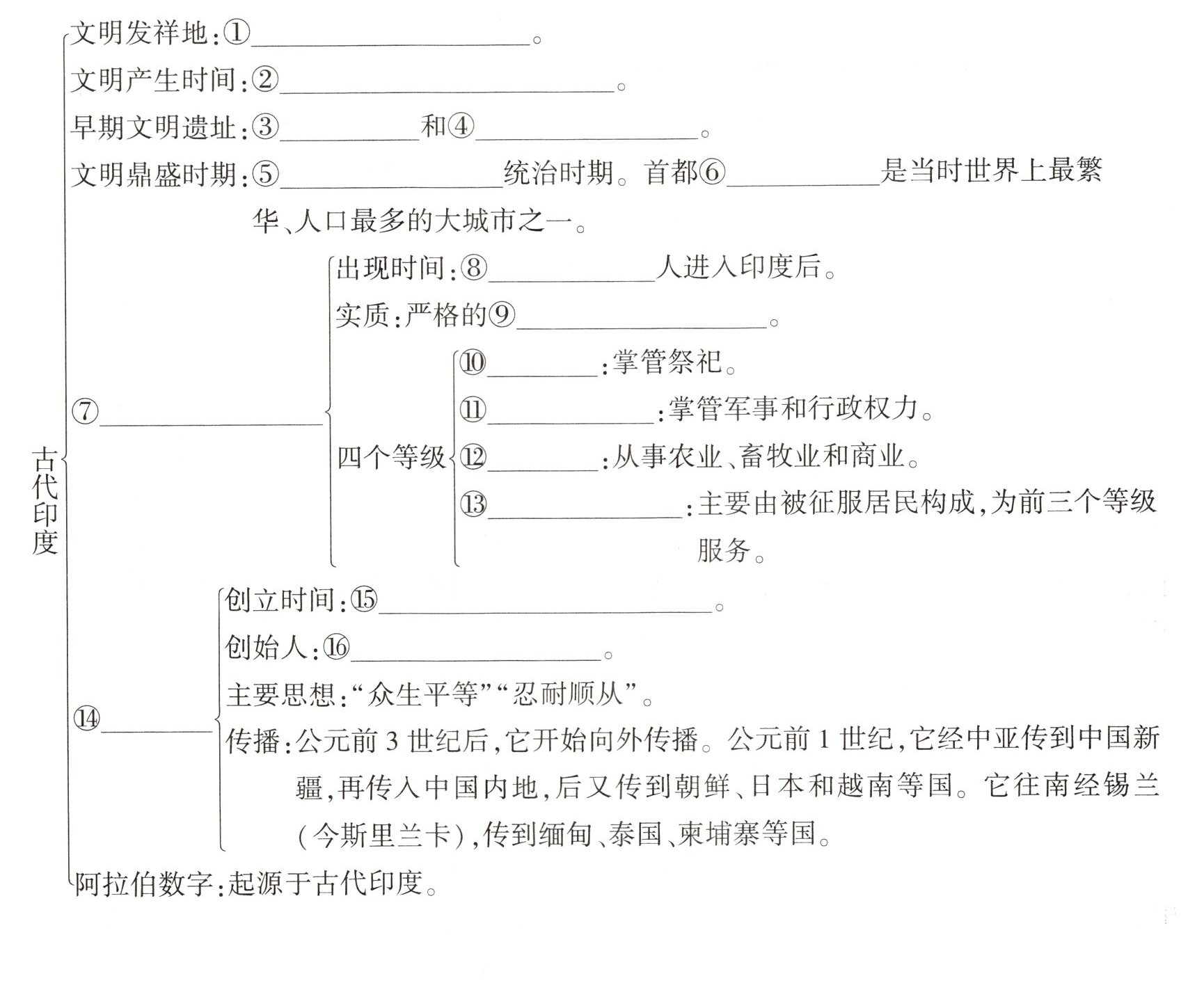 ①印度河流域 ②约公元前23世纪 ③哈拉帕 ④摩亨佐·达罗 ⑤孔雀王朝 ⑥华氏城 ⑦种姓制度 ⑧雅利安 ⑨社会等级制度 ⑩婆罗门 ⑪刹帝利 ⑫吠舍 ⑬首陀罗 ⑭佛教 ⑮公元前6世纪 ⑯乔达摩·悉达多