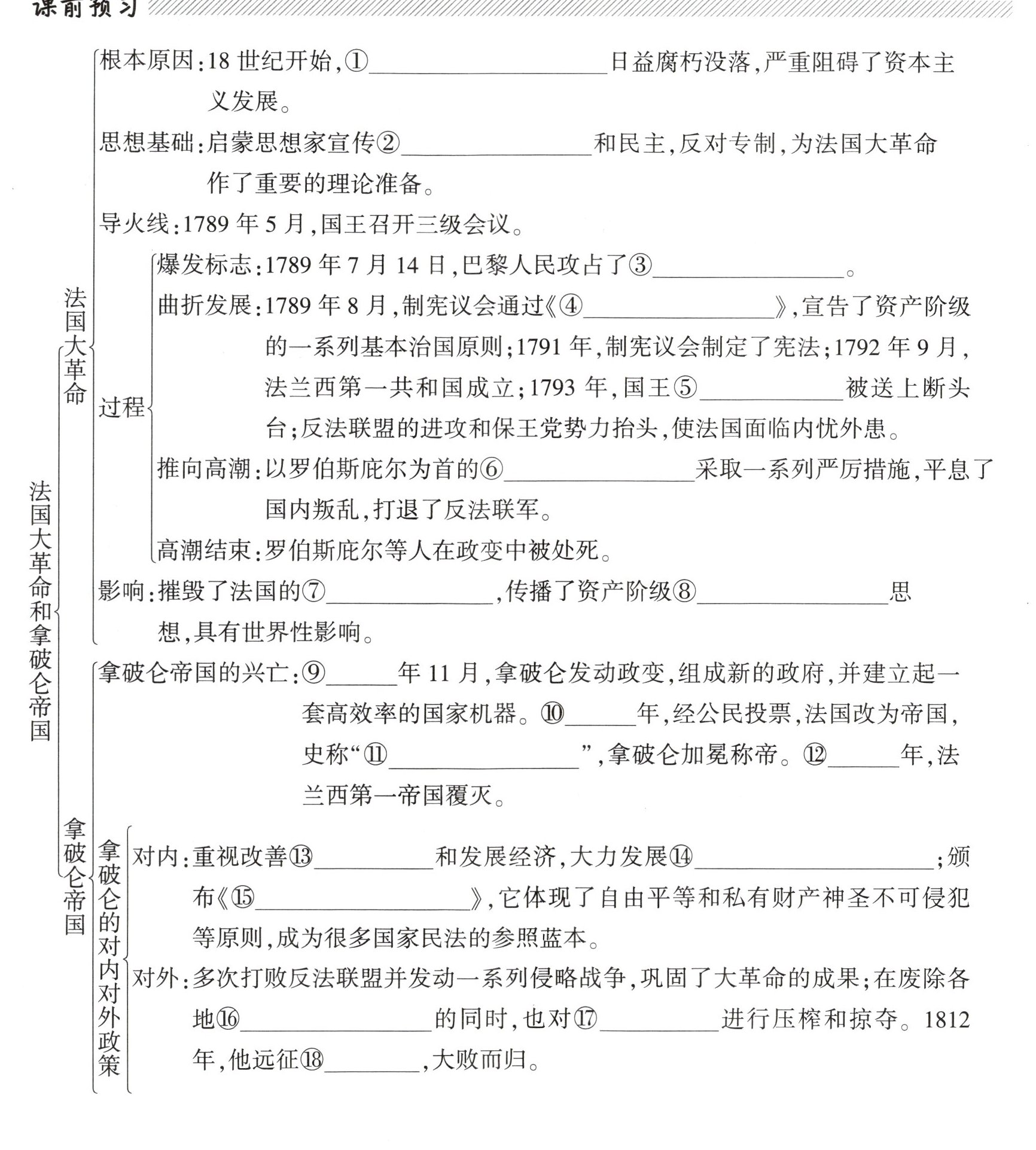 ①法国封建制度 ②自由、平等 ③巴士底狱 ④人权宣言 ⑤路易十六 ⑥雅各宾派 ⑦君主统治 ⑧自由民主 ⑨1799 ⑩1804 ⑪法兰西第一帝国 ⑫1815 ⑬财政 ⑭工商业和农业 ⑮拿破仑法典 ⑯封建特权 ⑰当地人民 ⑱俄国