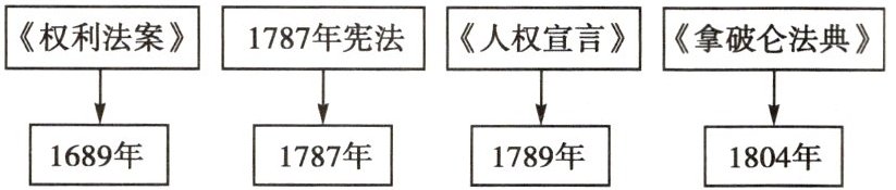 A 【解析】题干图示中的四大文献,是欧美社会巨变中资产阶级颁布的法律文件,文件宣扬资产阶级自由民主的思想观念,初步确定了资本主义社会的政治架构,推动欧美社会由专制向民主、由人治向法治的转型。故正确选项为 A。