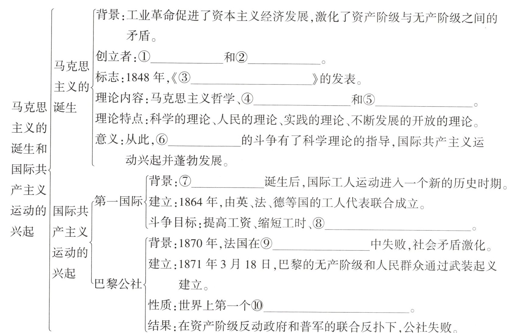 ①马克思 ②恩格斯 ③共产党宣言 ④政治经济学 ⑤科学社会主义 ⑥无产阶级 ⑦马克思主义 ⑧改善劳动条件 ⑨普法战争 ⑩无产阶级政权