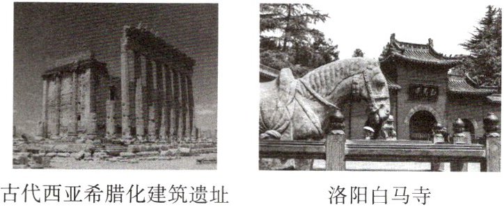 5.【示例】题目:古代不同方式的文明交流 短文:公元前4世纪,亚历山大东征,建立了地跨欧、亚、非三洲的大帝国,将希腊文化传到东方,如古代西亚出现希腊化建筑遗址。两汉之际,佛教传入中国,东汉时期,我国出现了第一座佛教寺院白马寺。二者都是文明交流的表现。在方式上,前者为暴力征服,后者为和平往来。在内容上,前者为古代希腊文化,后者为印度佛教文化。