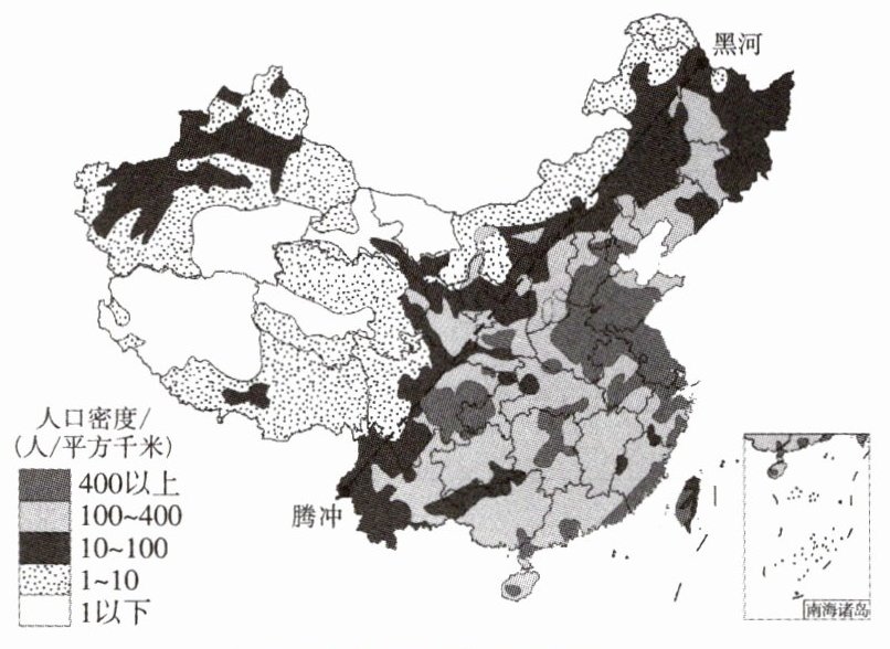 黑河—腾冲线(胡焕庸线)是我国人口分布的地理界线,读中国人口密度分布示意图,回答1~5题。