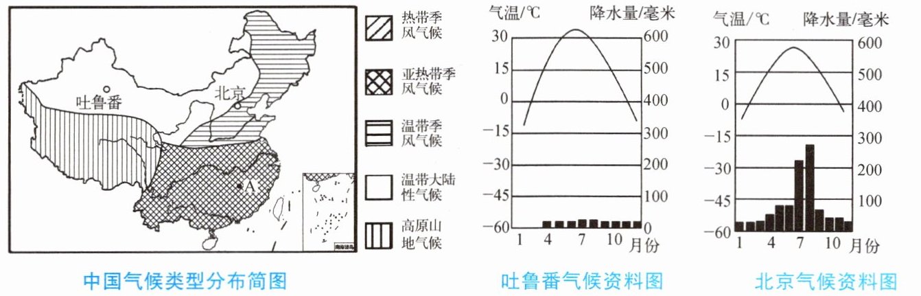 22. 读中国气候类型分布简图和吐鲁番、北京两地气候资料图,回答下列问题。
