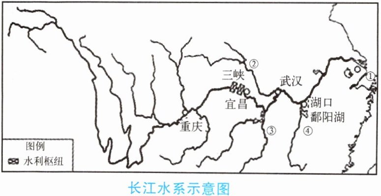海。(2)根据下列描述在长江水系示意图中选择序号。