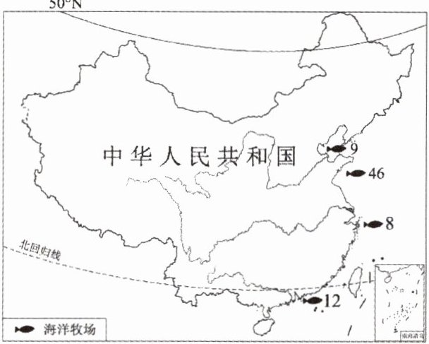 海洋牧场是采用规模化渔业设施,利用自然的海洋生态环境,像在陆地放牧牛羊一样,对鱼、虾、贝、藻等海洋资源进行有计划、有目的的海上放养。右图为中国国家级海洋牧场示范区在四大海域的分布图。据此,回答4~7题。