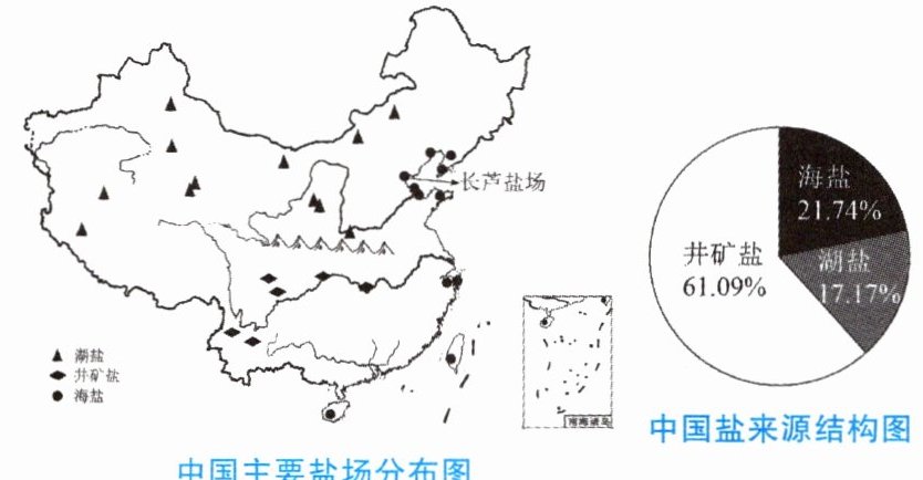盐广泛应用于食品、工业生产等领域,根据来源可分为海盐、湖盐、井矿盐等。下图中左图为中国主要盐场分布图,右图为中国盐来源结构图。据此,回答1~3题。