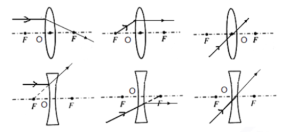 平行于主光轴的光经凸透镜折射后,会聚在主光轴上的点叫做焦点,焦点到凸透镜光心的距离叫做焦距,凸透镜两侧各有一个焦点。平行于主光轴的光经凹透镜折射后发散,折射光线的反向延长线会聚在主光轴的点叫做焦点,凹透镜也有两个焦点。