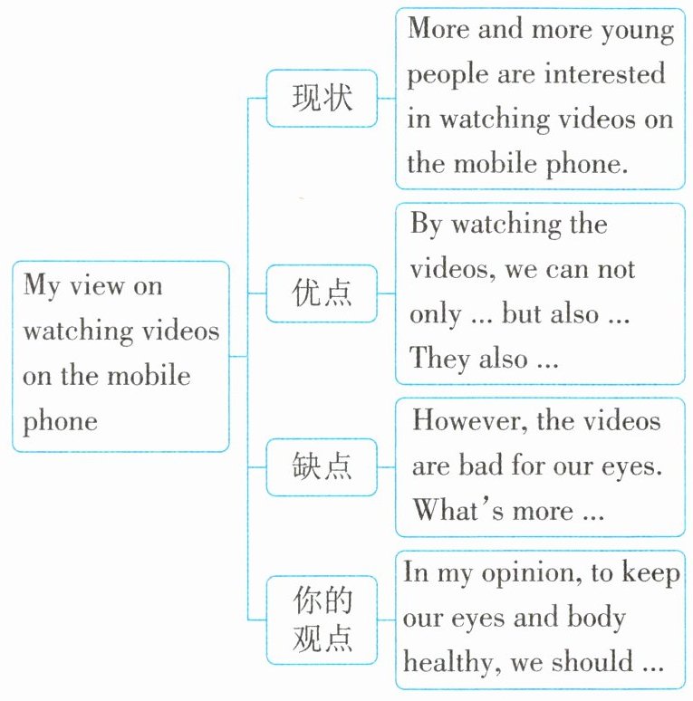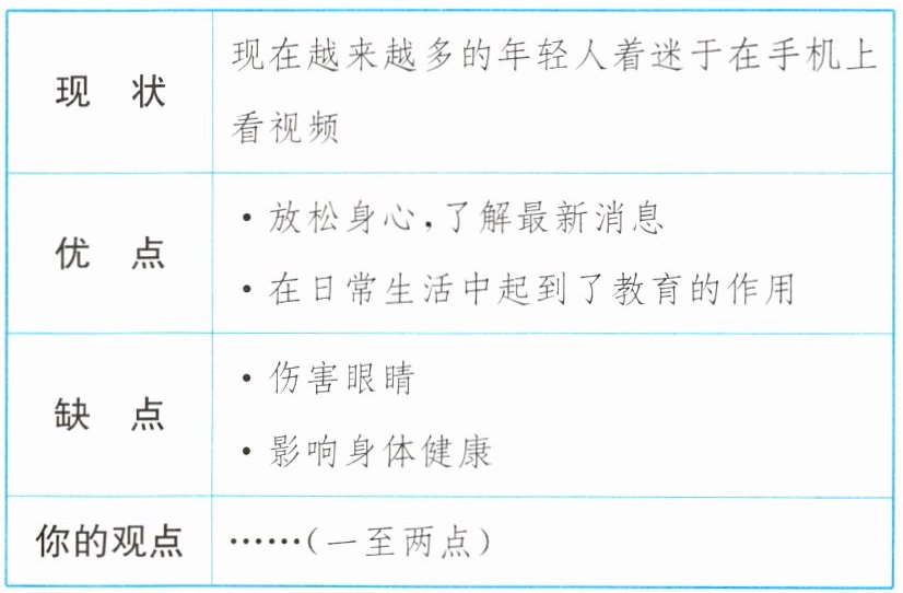 请你根据下面的表格内容,以“My view(看法、观点)on watching videos on the mobile phone”为话题,完成 90 词左右的短文。