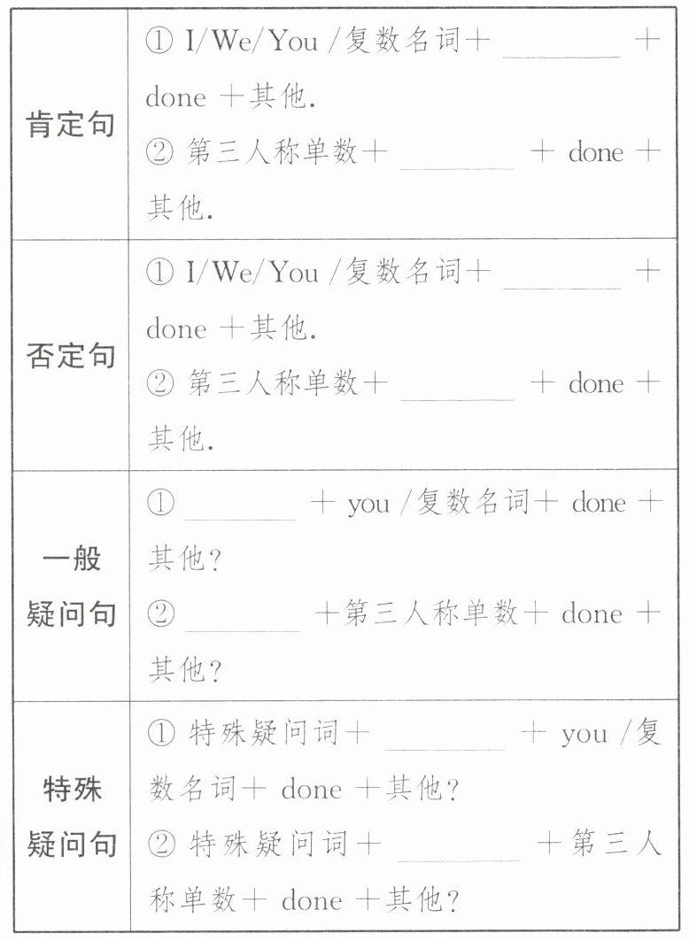肯定句:① have ② has 否定句:① haven't ② hasn't 一般疑问句:① Have ② Has 特殊疑问句:① have ② has 注意:just; already; yet 一、1. have; finished 2. has; sent 3. haven't; received 4. have; seen