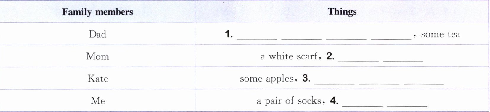 1. a bag of rice 2. some sugar 3. a pencil case 4. a kite 解析:根据短文第7~10句话可知,“我”原来想买一个篮球,但它太贵了,然后“我”就买了一个风筝。