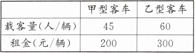 11. (张家界中考)为拓展学生视野,某中学组织八年级师生开展研学活动,原计划租用45座客车若干辆,但有15人没有座位;若租用同样数量的60座客车,则多出三辆车,且其余客车恰好坐满.现有甲、乙两种客车,它们的载客量和租金如下表所示: