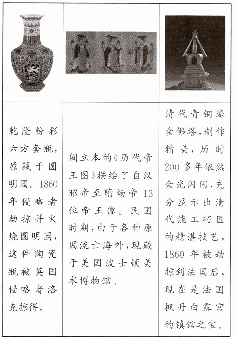 (1)侵略者:英国、法国。主要原因:近代中国国力衰微,列强入侵,掠夺了我国大量文物。