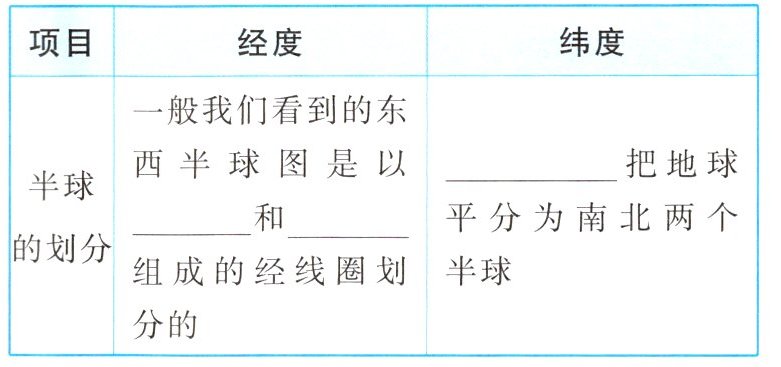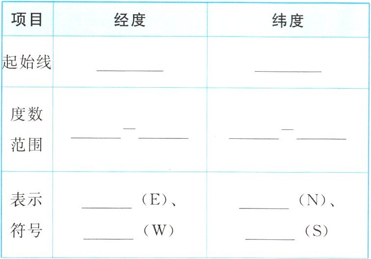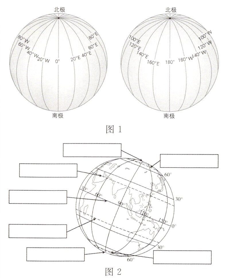 1. 在图1中填写本初子午线。根据图1写出经度的划分规律为