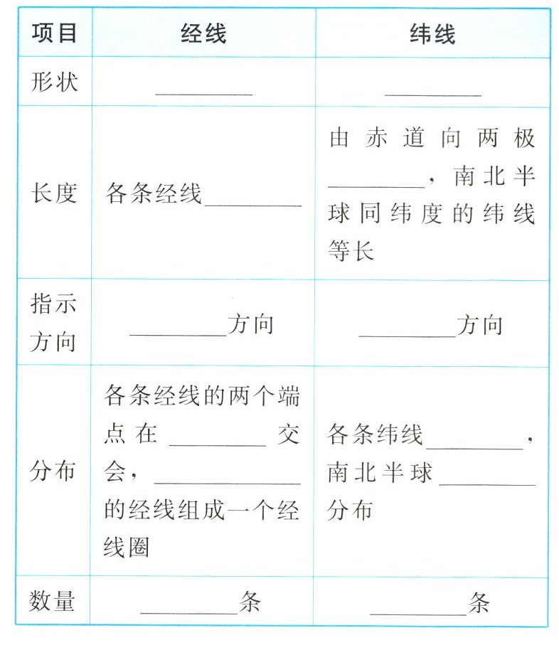 |分布|各条经线的两个端点在南北两极交会,任意两条相对的经线组成一个经线圈|各条纬线平行,南北半球对称分布|