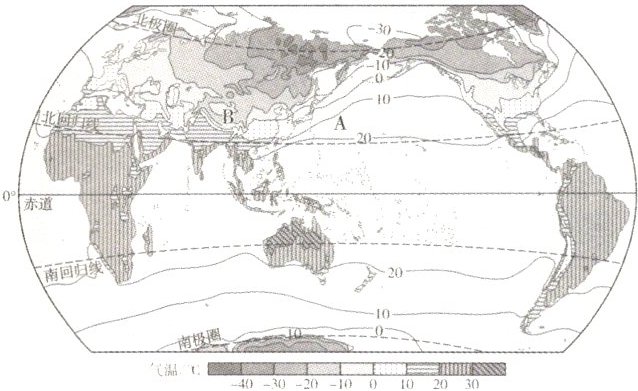 世界气温分布具有明显的季节差异,下图为某月世界平均气温分布图。据此完成3~5题。