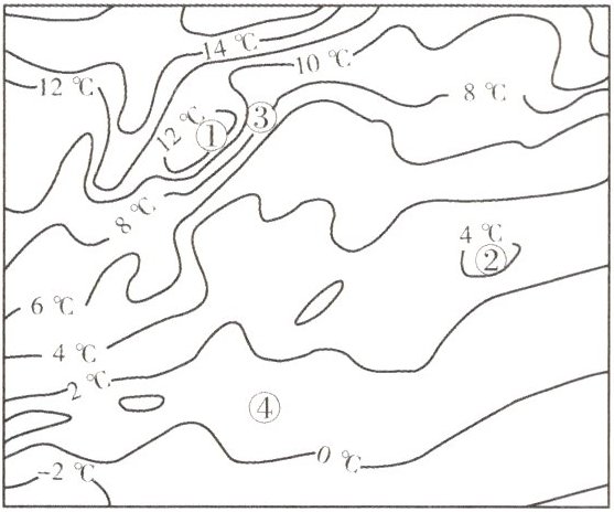 2. 关于图中①②③④四地气温状况的描述,错误的是(