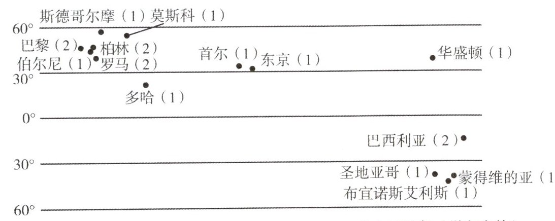)①巴西利亚最靠近赤道 ②斯德哥尔摩纬度最高 ③华盛顿纬度是南纬 ④首尔所在纬线长于多哈所在纬线