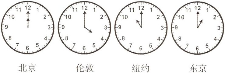 5. 贝贝到厦门旅游,看见宾馆大厅的四个时钟分别表示四个城市的时间(如下图),同一时刻四个城市时间不同的原因是(