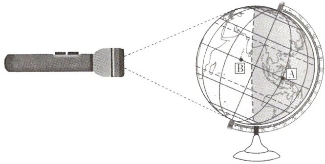 (4)选择地球仪上的A点和B点进行观察。我们可以看到,当A点正处于日出之时,B点正处于黑夜,说明了两地存在着______。