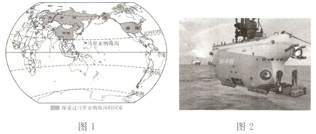 图1为探索过马里亚纳海沟的国家分布图,图2为我国研发的“奋斗者”号载人潜水器图片。据此完成3~5题。