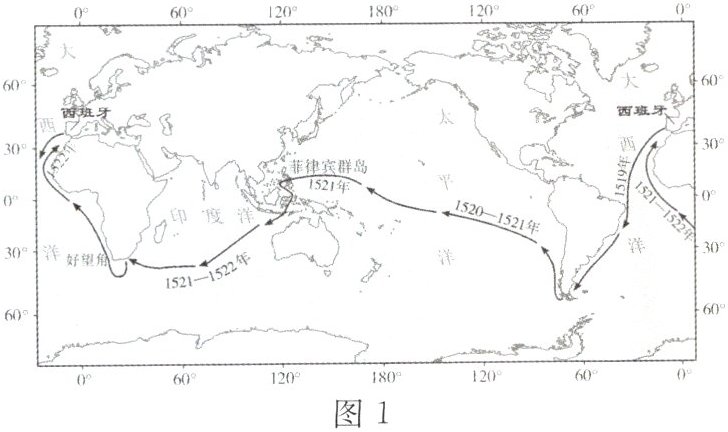 1. 图1中麦哲伦率领的船队环球航行证实了(
