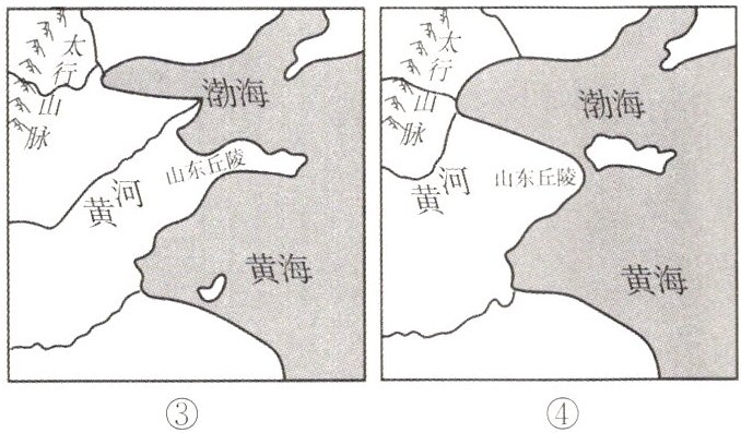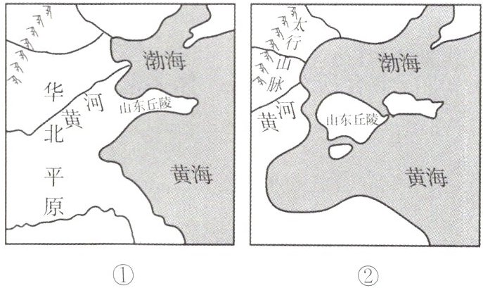 在地质历史时期,我国的华北平原是一片浅海,山东丘陵是海中岛屿。由于黄河等河流挟带大量泥沙逐步堆积,使陆地不断扩大,海岸线不断向外推移,经过长期的变化,原来的海湾最终形成了华北平原。据此完成1~2题。