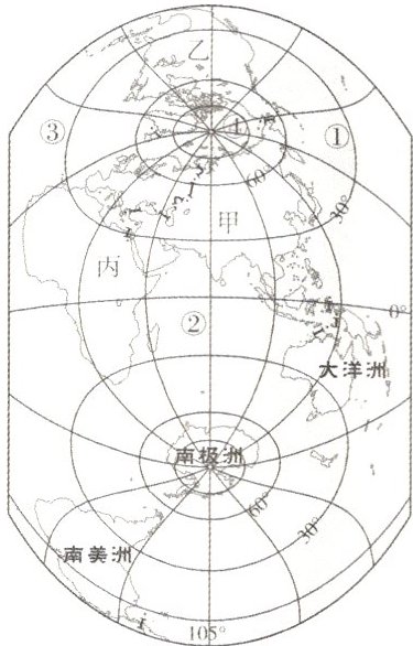 “竖版世界地图”以崭新的视野展示世界,清晰显示出被三大洲环抱的北冰洋,以及轮廓好似“孔雀开屏”的南极大陆。读竖版世界地图,完成3~5题。