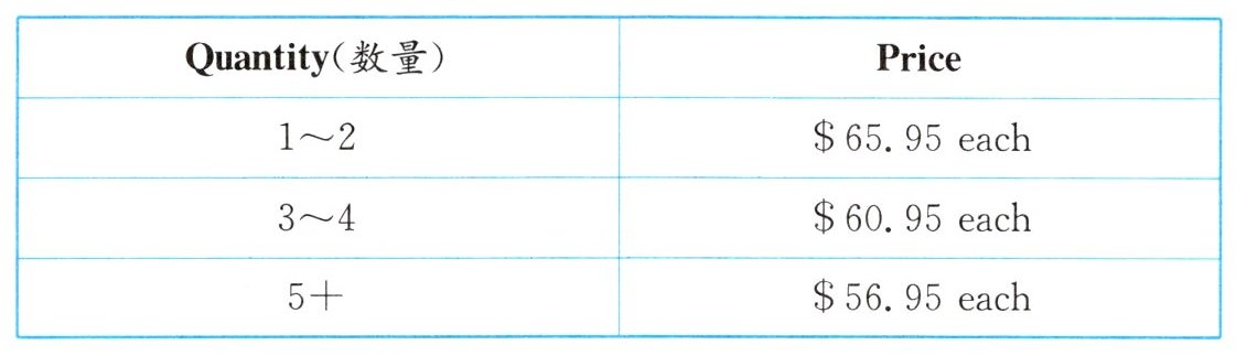2. C 【解析】推理判断题。根据“Save with Volume Discounts!”下面的表格内容可知,买 5 个以上,每个牌子的价格是 56.95,那么 6 个牌子的价格是 56.95×6=341.7。