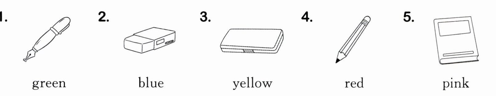 1. 钢笔涂成绿色 2. 橡皮涂成蓝色 3. 铅笔盒涂成黄色 4. 铅笔涂成红色 5. 书涂成粉红色