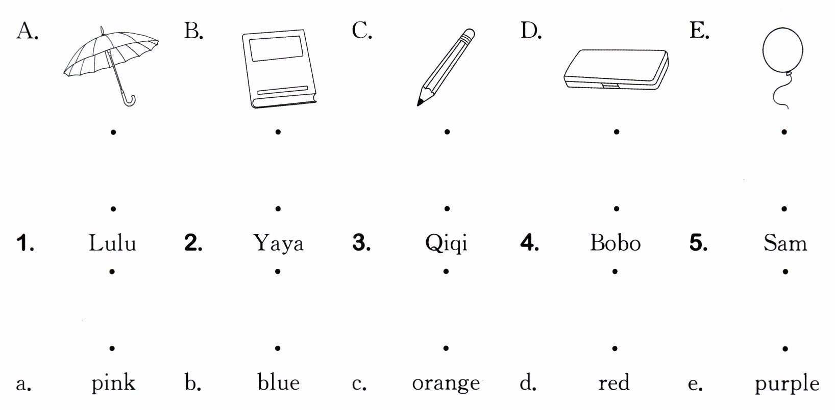 Ms Li: Hello, kids. Lili, colour(为……着色) the book green. Lele, colour the ruler blue. Dingding, colour the pen red. Amy, colour the umbrella yellow. Sam, colour the balloon purple.