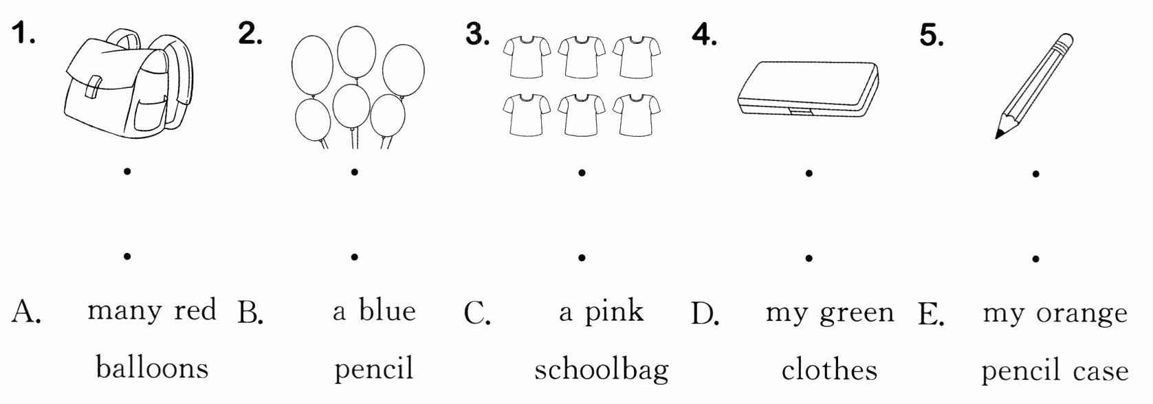 1. C 书包涂成粉红色 2. A 气球涂成红色 3. D 衣服涂成绿色 4. E 铅笔盒涂成橙色 5. B 铅笔涂成蓝色