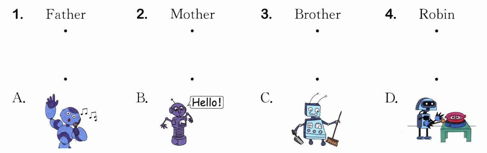 I’m Robin. This is my family. This is my father. He likes cooking. He can cook well. This is my mother. She is very beautiful. She likes making the room clean. This is my brother. He is two years old. He likes singing. He can sing songs. I am a pupil. I can speak English. Father buys robots for everyone. We love them. We are very happy.