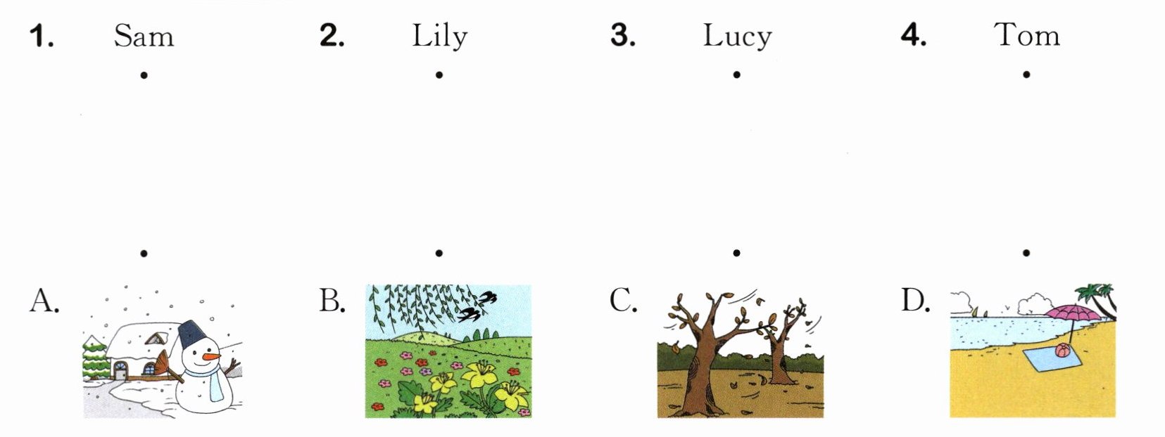 四、[新考法]读一读,猜一猜小朋友们分别喜欢哪个季节。请根据他们的介绍,把人物和对应的季节连线。