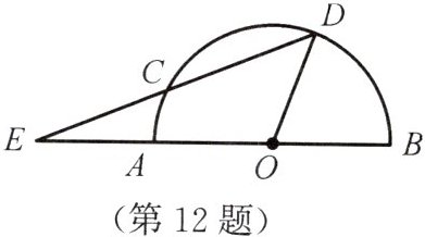 12. 如图,$ AB $ 是半圆 $ O $ 的直径,$ D $ 是半圆上的一点,$ \angle DOB = 75^{\circ} $,$ DC $ 交 $ BA $ 的延长线于点 $ E $,交半圆于点 $ C $,且 $ CE = AO $,求 $ \angle E $ 的度数.