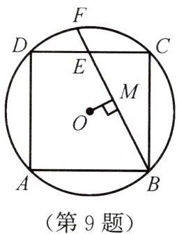 9. 如图,正方形ABCD内接于$\odot O$,E为DC的中点,直线BE交$\odot O$于点F,如果$\odot O的半径为\sqrt{2}$,那么点O到BE的距离$OM = $
