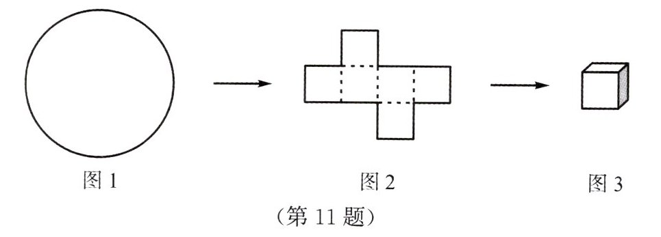 11. 将一直径为$2\sqrt{17}cm$的圆形纸片(图1)剪成如图2形状的纸片,再将纸片沿虚线折叠得到正方体(图3)形状的纸盒,则这样的纸盒体积最大值为