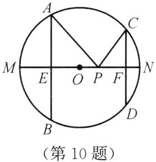 10. 如图,AB,CD是半径为5的$\odot O$的两条弦,$AB = 8$,$CD = 6$,MN是直径,$AB\perp MN$于点E,$CD\perp MN$于点F,P为EF上的任意一点,则$PA + PC$的最小值为