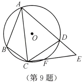 9. 如图,四边形 $ABCD$ 内接于 $\odot O$,$F$ 是 $\overset{\frown}{CD}$ 上一点,且 $\overset{\frown}{DF} = \overset{\frown}{BC}$,连接 $CF$ 并延长交 $AD$ 的延长线于点 $E$,连接 $AC$。若 $\angle ABC = 105^{\circ}$,$\angle BAC = 30^{\circ}$,则 $\angle E$ 的度数为(