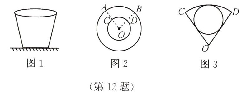 12. 如图 1 是我们常用的一次性纸杯,下面我们来研究一次性纸杯的制作方法之一. 如图 2,取一个半径为 $ 18 cm $ 的圆形纸板,再裁下一个半径为 $ 6 cm $ 的同心圆纸板,沿半径 $ OA $, $ OB $ 及 $ CD $, $ AB $ 剪下,由 $ AB $, $ CD $ 及线段 $ AC $ 和 $ BD $ 围成的部分即可围成纸杯侧面,然后在扇形 $ OCD $ 中再截取一个面积最大的圆形纸板.