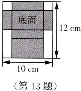 13. 【山西】如图是一张长 $ 12 cm $、宽 $ 10 cm $ 的矩形铁皮,将其剪去两个全等的正方形和两个全等的矩形,剩余部分(阴影部分)可制成底面积是 $ 24 cm^{2} $ 的有盖的长方体铁盒,则剪去的正方形的边长为