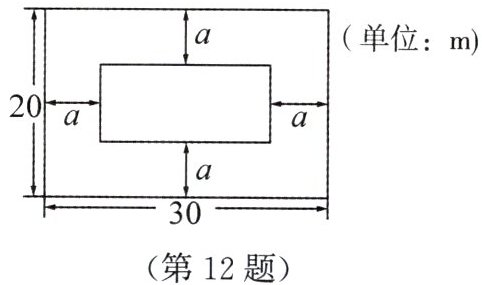 12. 【江西】如图,为美化校园环境,学校打算在长为 $ 30 m $、宽为 $ 20 m $ 的长方形空地上修建一个长方形花圃,并将花圃四周余下的空地修建成宽为 $ a(m) $ 的通道.若花圃的面积恰好等于 $ 264 m^{2} $,则通道的宽为