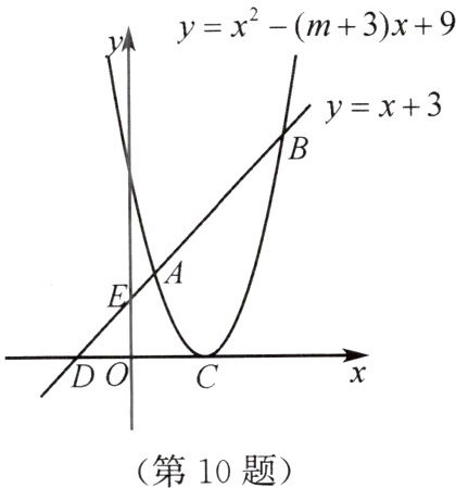 10. 【凉山州】如图,已知抛物线 $ y = x^2 - (m + 3)x + 9 $ 的顶点 $ C $ 在 $ x $ 轴正半轴上,一次函数 $ y = x + 3 $ 的图象与抛物线交于 $ A $,$ B $ 两点,与 $ x $,$ y $ 轴交于 $ D $,$ E $ 两点。