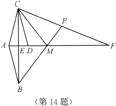 14. 如图,$\triangle ABM$ 与 $\triangle ACM$ 关于直线 $AF$ 成轴对称,$\triangle ABE$ 与 $\triangle DCE$ 关于点 $E$ 中心对称,点 $E$,$D$,$M$ 都在线段 $AF$ 上,$BM$ 的延长线交 $CF$ 于点 $P$.